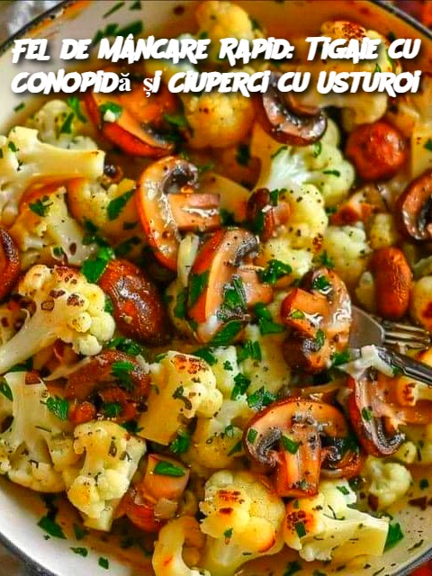 Adaugă buchețelele de conopidă peste ciuperci. După un minut, adaugă usturoiul tocat. Gătește totul împreună încă 5 minute, până când legumele se rumenesc ușor.